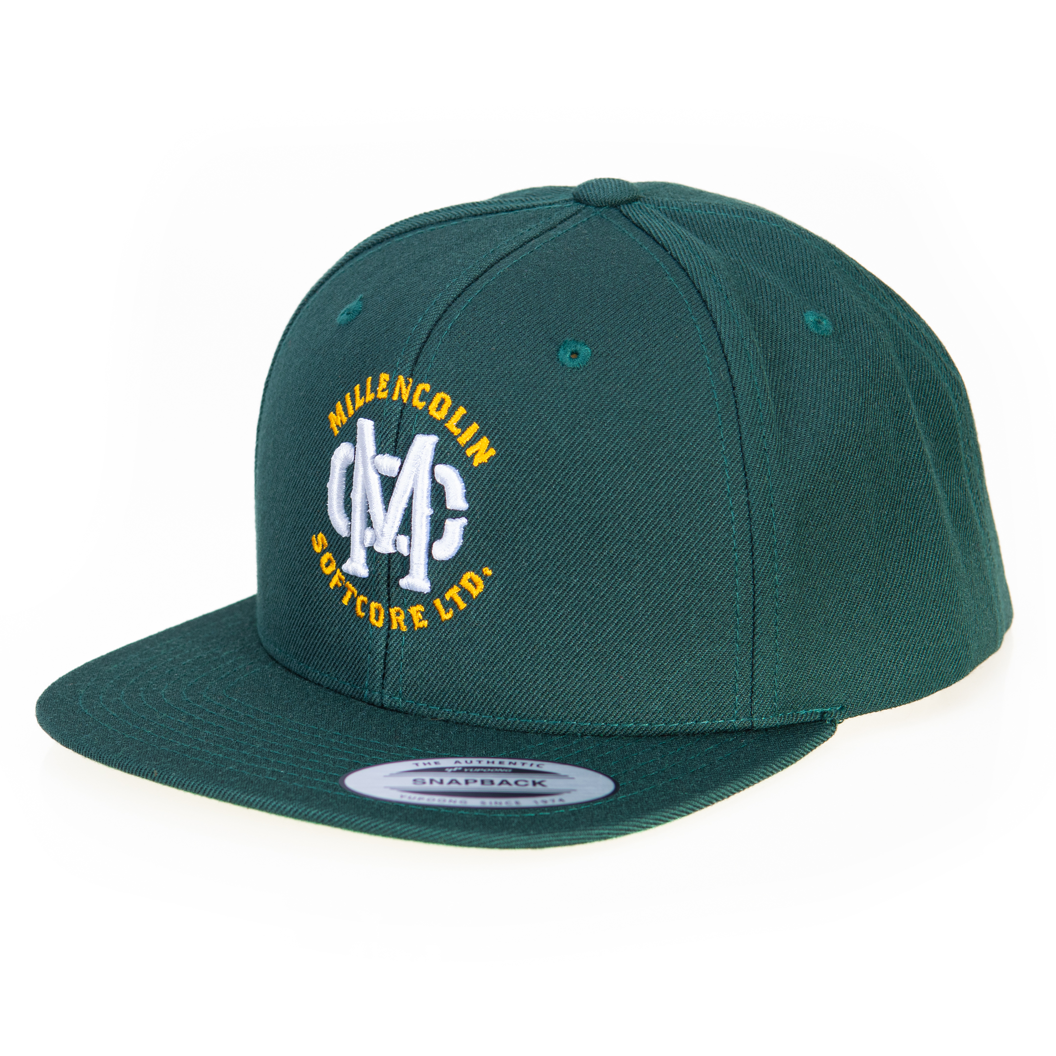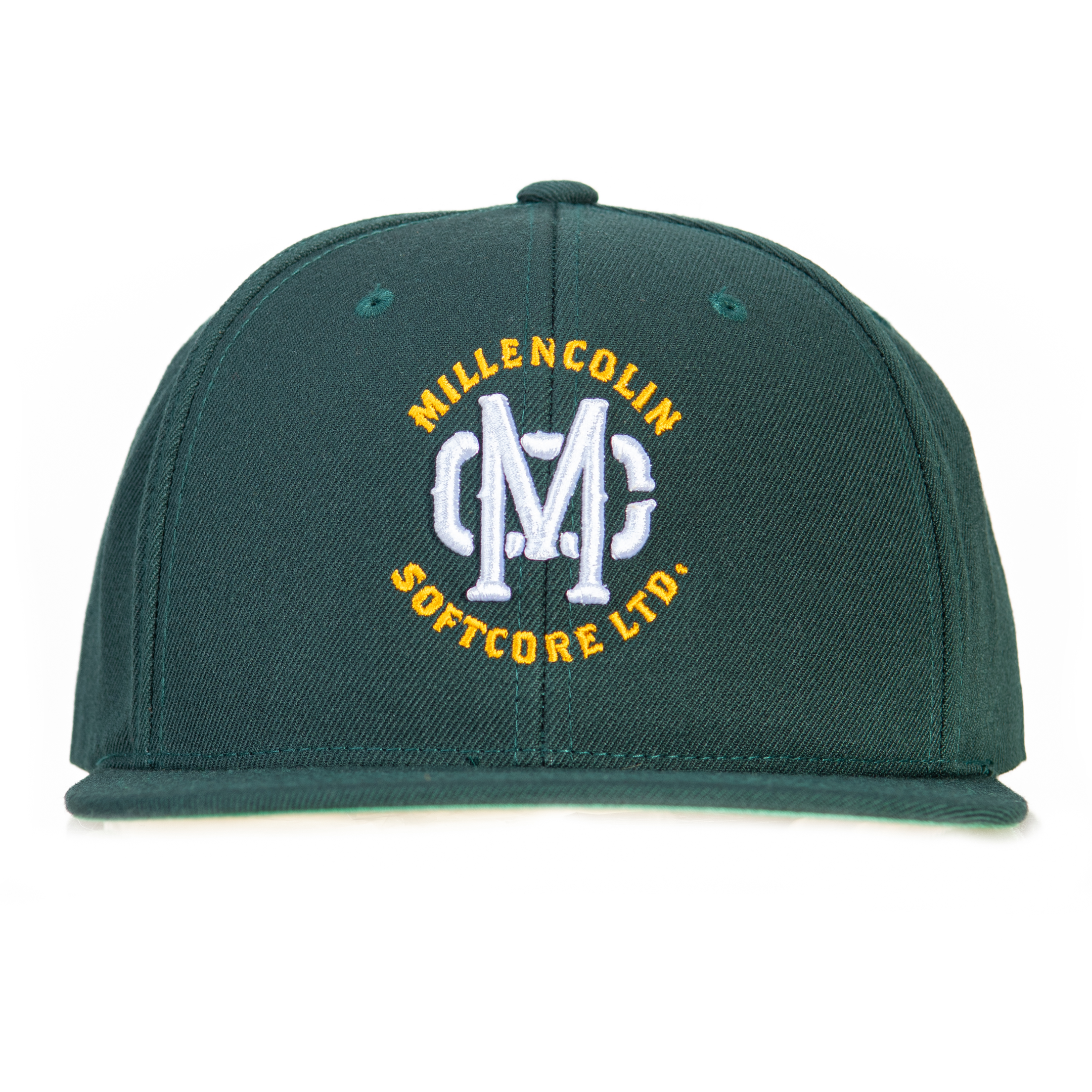 Green cap with yellow 2D embroidery and white 3D embroidery.